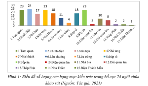 + Bố cục theo trục có 2 dạng: theo trục và không theo trục; loại theo trục chiếm số lượng lớn, loại không theo trục chỉ có 1 chùa.
