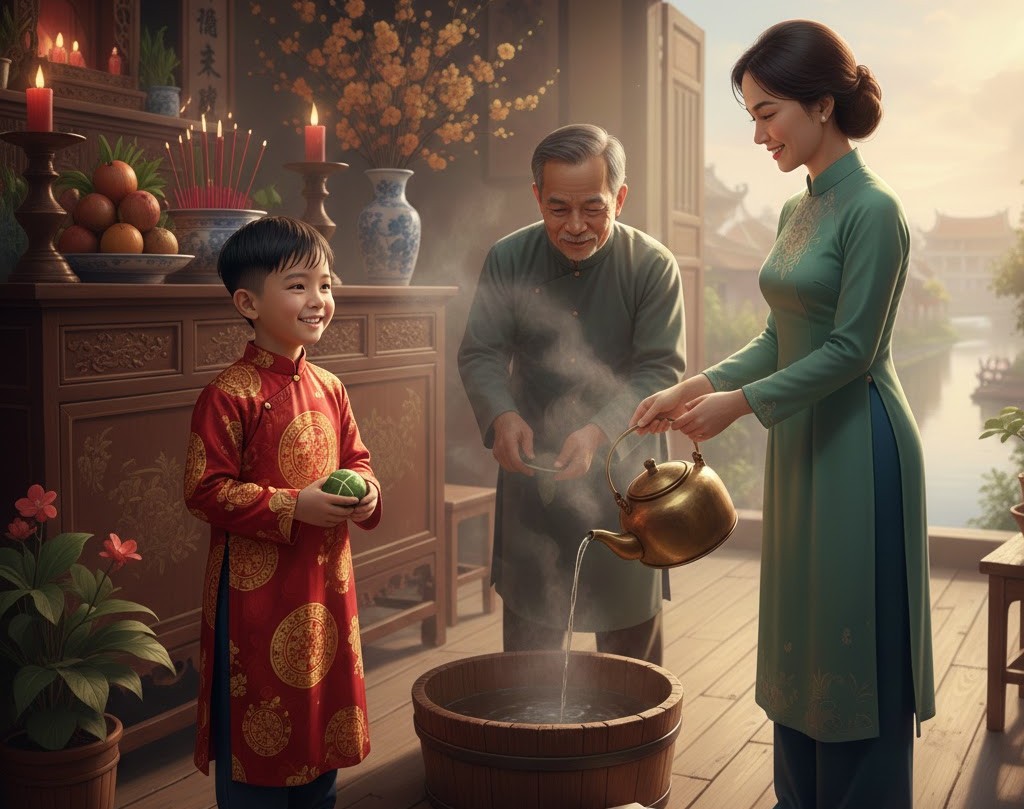 Bởi vậy, chiều ba mươi Tết, cái ấm nước sôi được tận dụng hết khả năng lao động của nó để cục xà bông được trùng phùng với da thịt của mọi thành phần trong gia đình.