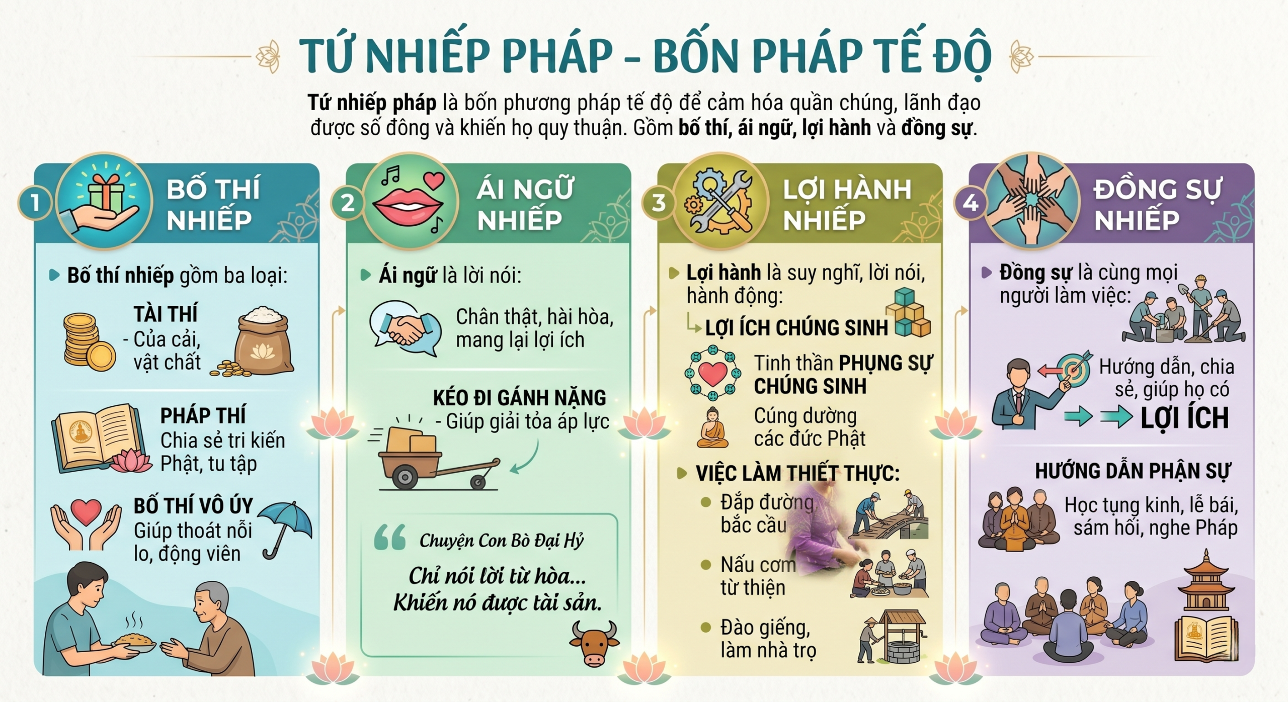 Tứ nhiếp pháp là một Pháp trong nhà Phật; nếu thực hành theo, ta sẽ thu phục và lãnh đạo được đông đảo đại chúng. Không chỉ vậy, nhờ thực hành Tứ nhiếp pháp, chúng ta cũng sẽ được nhiều người yêu mến, hạnh phúc và phát triển dù ở bất cứ đâu.